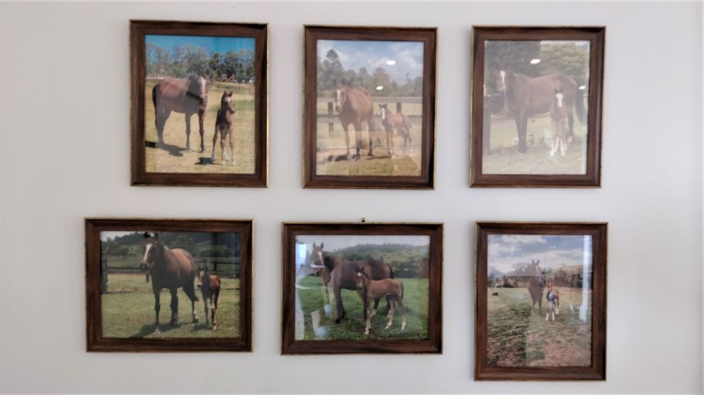 There’s something quietly powerful about a wall of framed photos—especially when they tell a story. The arrangement you’ve created here does exactly that: six framed images, evenly spaced, each capturing a moment between a mare and her foal across time. It’s not just decoration—it’s a narrative.